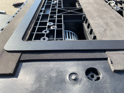 The waterproof gasket was adhered to the roof and sealed using a butyl rubber sealant as recommended in the user guide. By the time he got the A/C on the roof, the sun was beginning to set and dusk upon us. You can imagine his surprise when he went into the van to check the fit and saw daylight peeking through the opening inside the dark van (last picture). This caused us quite some concern regarding the potential for future leaks. Which also meant we had to take the A/C back off the roof, flip it over, and figure out where the gap was in the undermount.