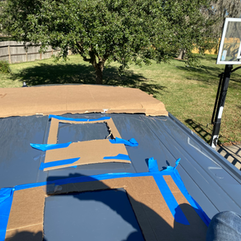 And as we plan to install a solar panel later, we used CAD (cardboard assisted designs) to make sure all three items would fit and that we didn't run into any interference issues later. We also had to consider the location of the internal ribs of the roof (see middle photos) to ensure we weren't trying to cut a hole through one of those. Ryan used a drill bit to start holes in the corners of each square and made the straight cuts with a nibbler. You can see the CAD layout in the first photo, and later the cutout for the fan and where the cut for the A/C will go. After cutting, he filed and primed both openings to protect the edges from rust.